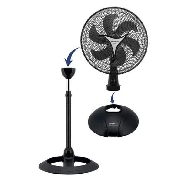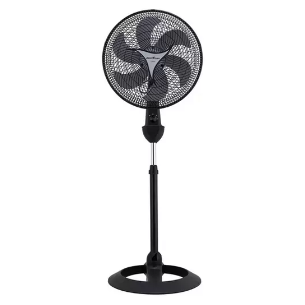 3 velocidades. Hélice de 6 pás. Grade que obedece às normas de segurança (contato com partes móveis). Oscilação horizontal automática com novo sistema de acionamento (botão integrado à carcaça). Novo sistema de articulação para ajuste da inclinação vertical (sem borboleta). Porta-fio. Novo sistema de travamento entre grade frontal e traseira. Remoção da grade frontal conforme normas de segurança. Motor com fusível térmico de segurança. Alça na grade traseira para transportar o aparelho. Sistema Easy to Go: base removível para maior facilidade de transporte e armazenamento. Base redonda e altura regulável: ótima estabilidade e maior alcance do fluxo de ar. Pode ser usado na versão mesa ou coluna, uma unidade motora, 1 base de mesa e 1 base coluna.