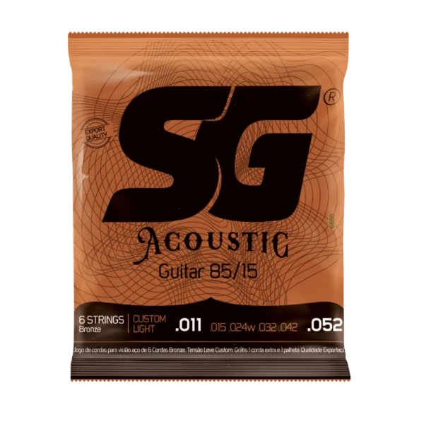Encordoamento SG Violão 6 Cordas 0.11 + PALHETA As cordas de tensão Light são ideais para músicos que não utilizam muita pressão nas mãos ou que prefiram uma sonoridade mais quente, porém suave. Em solos ou palhetadas, o timbre é sempre limpo e contagiante, seja qual for o estilo musical. Encordoamento que, além de um equilíbrio sonoro sensacional, traz a verdadeira sensação do folk. Com timbre quente e brilho enriquecido, a linha 85/15 traz a matéria-prima mais equilibrada (em questão de durabilidade, conforto e som) dentre as usadas para instrumentos acústicos. Medidas para uso em escala com comprimento de 25 ½? / 648mm. Cordas primas em aço estanhado cilíndrico. Bordões com revestimento de bronze 85/15 e núcleo hexagonal de aço estanhado. Tensão E1 B2 G3 D4 A5 E6 B7 Light .011 .015 .024 .032 .042 .052 Pacote com 1 jogo com 6 cordas + 1 palheta