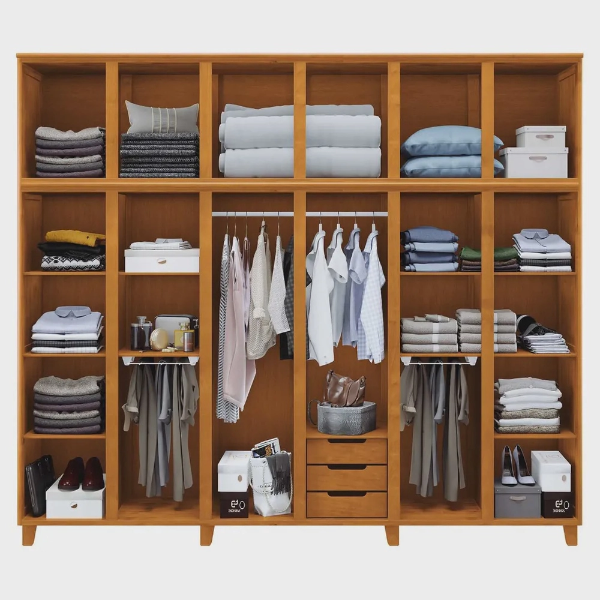 Estrutura em Madeira de Pinus Reflorestada, acabamento feito em Poliuretano (pu) fosco, que preserva as características da madeira e garante uma ótima conservação e durabilidade do produto. Outros detalhes são seus puxadores em madeira na cor do roupeiro e cabideiro em madeira de alta resistência que valorizam ainda mais o produto. Fundos e bases são em material Duraplac que é uma chapa de fibra pintada anti mofo. Foto meramente ilustrativa. Dimensões Altura: 221 cm Largura: 254 cm Profundidade: 50 cm.