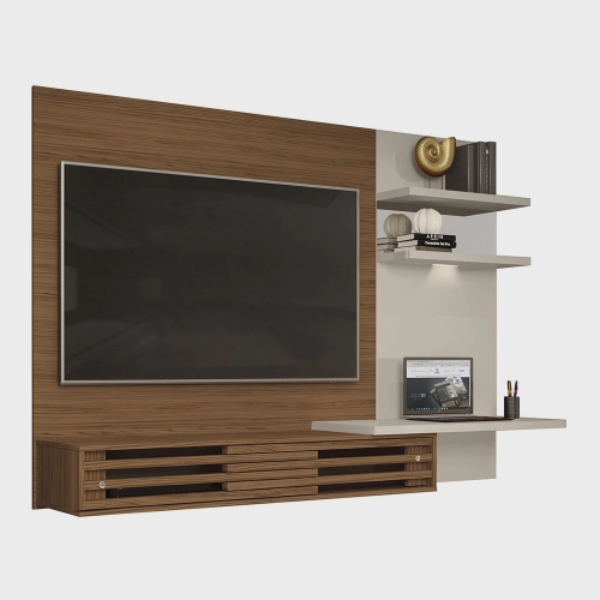 Feito para casas compactas, o Painel Office Frizz Star é um móvel multifuncional. Além de um painel para TV de até 55”, possui uma bancada para utilização de um notebook! Possui peças de 15 e 25mm, luminária de LED, espelho e portas deslizantes Frizz. Portas deslizantes frisadas que se sobrepões Espaço para Notebook com Luminárias de Led Espelho Prateleiras para objetos decorativos Paineis em MDP 15, 25mm Fixação com minifix. Cor: Naturale / Off White Quatidade de Portas: 2 Tipo de Porta: Deslisante Gaveta: não Prateleiras: 3 Prateleira de Vidro: não Espelho: sim Pés: não Rodízios: não Iluminação: 1 Luminária Led Nicho: não Peso Suportado (Kg): 47 Largura (mm): 1970 Altura (mm): 1355 Profundidade (mm): 425 Espaço para TV: Largura (mm): 1350 - Altura (mm): 1120 Imagem meramente ilustrativa!