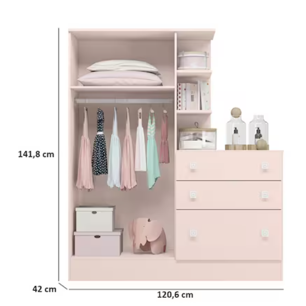 O Roupeiro c/ Cômoda Doce Sonho Rosa Acetinado foi desenvolvido para trazer praticidade e charme ao quarto infantil. Seu design delicado e moderno, aliado ao acabamento em rosa acetinado, transforma o ambiente em um espaço acolhedor e cheio de encanto. Com amplo espaço interno, o roupeiro permite organizar roupas, acessórios e brinquedos de forma prática e funcional. Além disso, a cômoda integrada oferece ainda mais comodidade no dia a dia, ajudando a manter tudo sempre no lugar. Cada detalhe foi pensado para unir beleza, funcionalidade e aconchego, tornando o quarto da sua princesa ainda mais especial. O Roupeiro Doce Sonho é a escolha ideal para quem deseja aliar organização e elegância em um só móvel. Dimensões: altura: 141,8 cm; largura: 120,6 cm; profundidade: 42 cm;